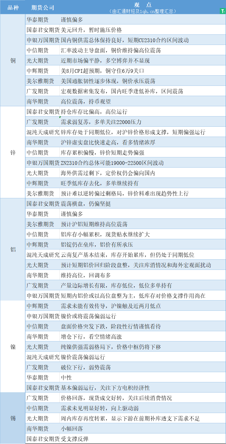 汇通财经APP讯——期货公司观点汇总一张图:9月14日有色系(铜、锌、铝、镍、锡等)