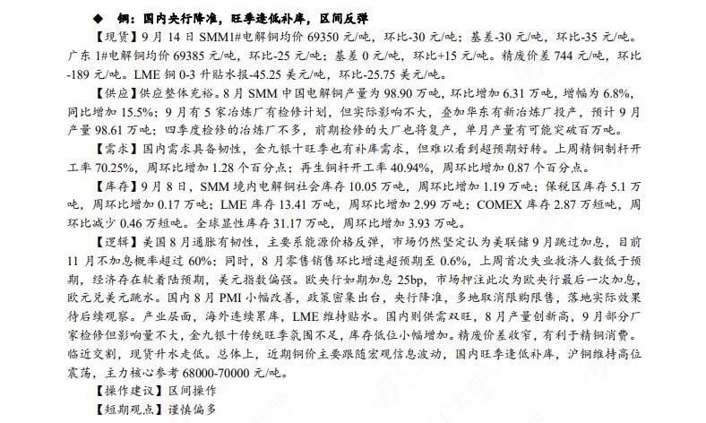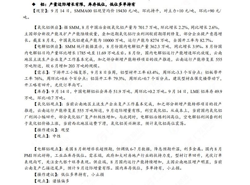 汇通财经APP讯——广发期货发布9月15日早知道,国债期货单边策略上建议短期可参与逢低做多,铜区间操作,谨慎偏多;铝低位多单持有,小止损;宏观和产业共振支撑钢价偏强震荡;焦炭盘面预计仍偏强运行;油价建议波段操作,布油上方压力关注95美元。