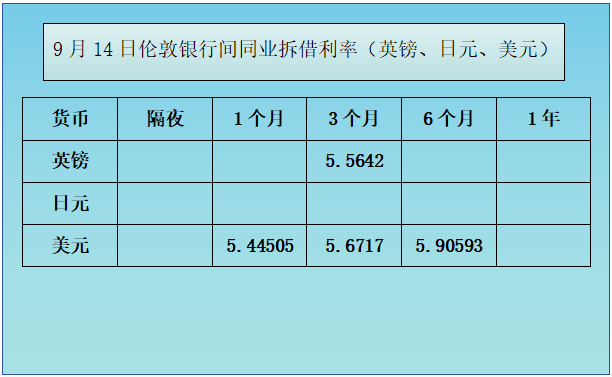 标题:9月14日伦敦银行间同业拆借利率(英镑、日元、美元)