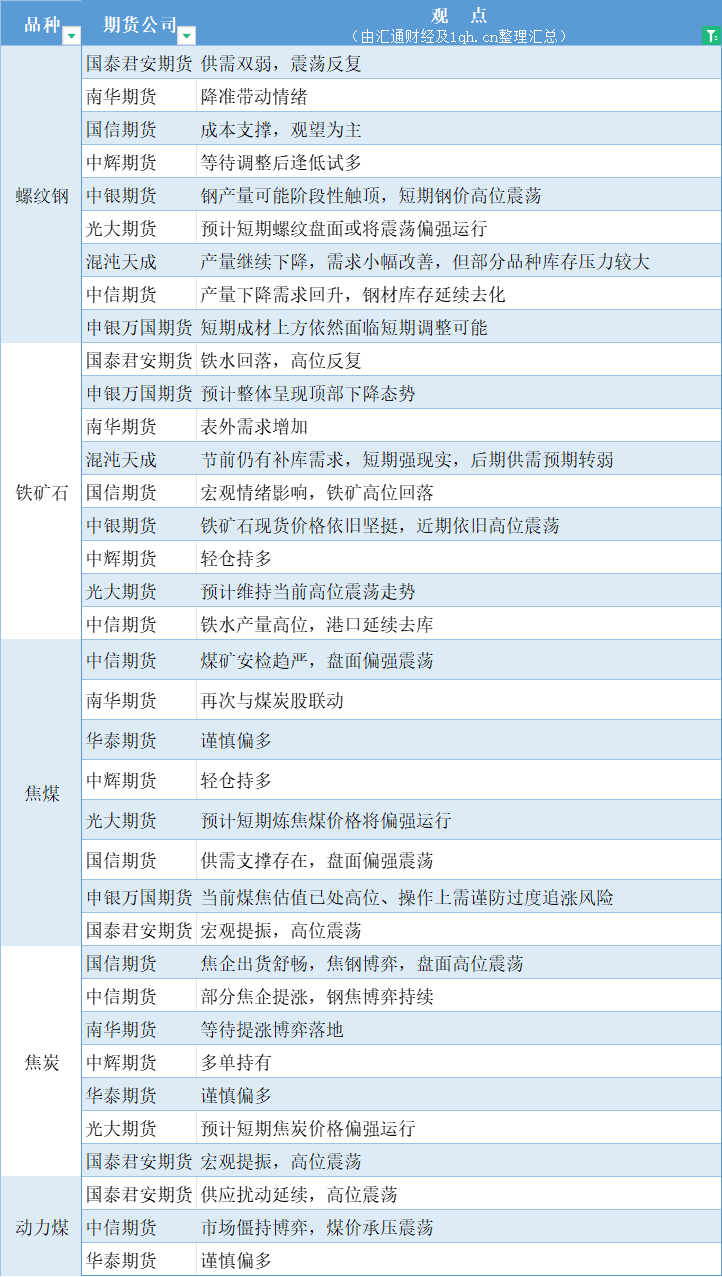 汇通财经APP讯——期货公司观点汇总一张图:9月18日黑色系(螺纹钢、焦煤、焦炭、铁矿石、动力煤等)