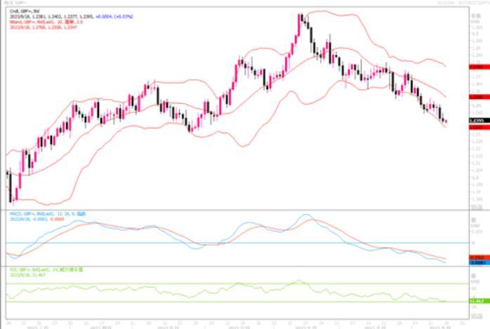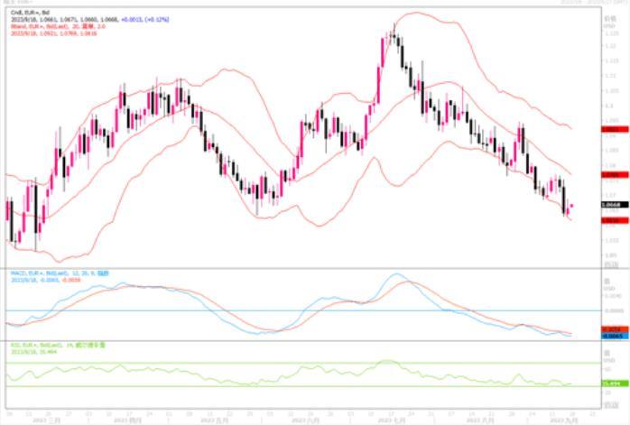 上周五(9月15日),欧元兑美元上涨0.2%,报1.0666美元,从周四触及的六个月低位1.0629美元小幅回升。欧洲央行上周四将利率上调至4%的纪录高位,但同时暗示可能不会再加息。不过,欧洲央行决策者淡化了已完成加息行动的看法,称利率将在较长时间内保持高位,甚至在必要时可能再次加息。消息稍稍稳定住欧元急剧下滑的脚步。而且上周五当天,美国公布的9月密西根大学消费者信心指数初值从8月终值69.5降至67.7,低于路透访查经济学家预测的69.1。美元指数也从近期高位稍有后撤,但周线仍连续第九周上涨。随着欧元利率有望见顶,而美元尚存多种选择,且美国经济发展状况优于欧元区国家,预料欧元兑美元走弱局势尚要延续。短线欧元兑美元有整理欲求,但日线图上继续受压各期限均线之下,技术指标虽有超卖但无调整痕迹,显示欧元保持着偏于下行的趋向。
