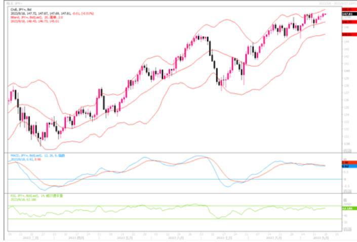 上周五(9月15日),美元兑日元盘尾上涨0.25%,报147.84,稍早还曾触及10个月高位147.96。尽管市场观察工具分析认为美联储不会在短期或中期内加息,但考虑到由于燃油重新上涨所引发的美国通胀率再度恢复回升,且经济方面尚能保持良性发展,美联储继续加息这个选项仍然不能被排除。即便年内美联储不再有加息举动,但一段时期内也不会有降息的希望。而且日本央行在利率方面一直迟迟未有任何实质的进展,终将会继续助长趋利交易模式的推进,投资者和交易员预料仍会继续尝试将美元/日元推向更高水位,直到引发日本央行出现雷霆般的干预,或才能喝止美元/日元这种无休止的冲高行市。日线图上,一直显示超买,且顶背离迹象一直存在。需时时警惕变盘的风险。