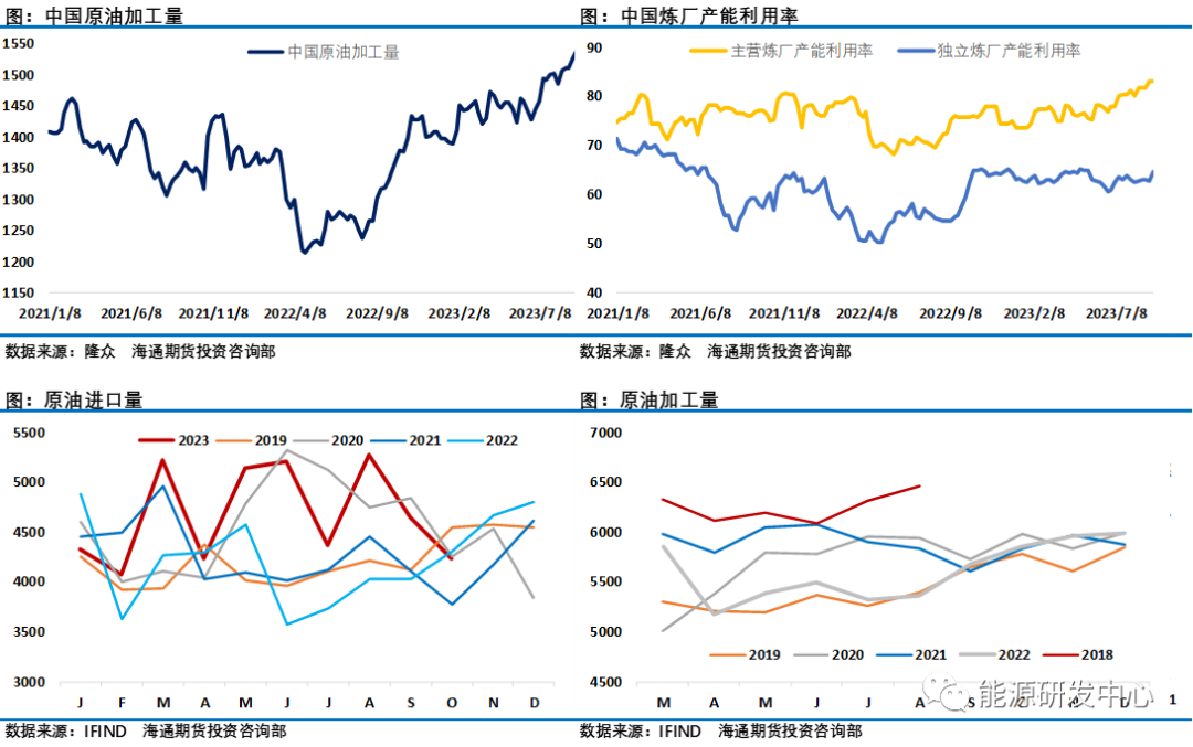 欧佩克在其月报中坚持其对2023年和2024年全球石油需求强劲增长的预测,理由是有迹象表明,尽管存在高利率和高通胀等不利因素,但主要经济体的表现好于预期。欧佩克月报显示,2023年世界石油需求将增加244万桶/天,2024年为225万桶/天,均与上月持平。国际能源署也维持了其对2023年石油需求将增加220万桶/天的判断。不过国际能源署对2024年石油需求增长预测较为谨慎,其判断经合组织的石油需求预计明年将进入长期下降阶段,而明年中国石油消费将没有疫情恢复增量,只是会有匹配经济增长水平的需求。欧佩克认为中国2023年石油需求增长将平均每日比去年增加160万桶。国际能源署同样将2023年全球石油需求增长预测保持在每日增加220万桶的稳定水平,将2024年石油需求增长预测保持在每日增加100万桶的水平。,欧佩克在报告中称:“预计全球经济持续增长将推动石油需求,特别是考虑到旅游业、航空旅行和稳定的驾车出行的复苏。全球石油总需求将在2023年超过疫情前的水平。”中国市场高频数据显示原油加工量继续攀升至创纪录高位,不过随着油价走高中国原油进口量较上半年出现回落,更多的炼厂开始消化之前的库存原油以缓解成本抬升压力,目前来看中国国内炼厂油裂解差回落明显,炼厂利润被挤压明显,后续中国市场成品油能否匹配原油强势将是需求端值得关注的因素。