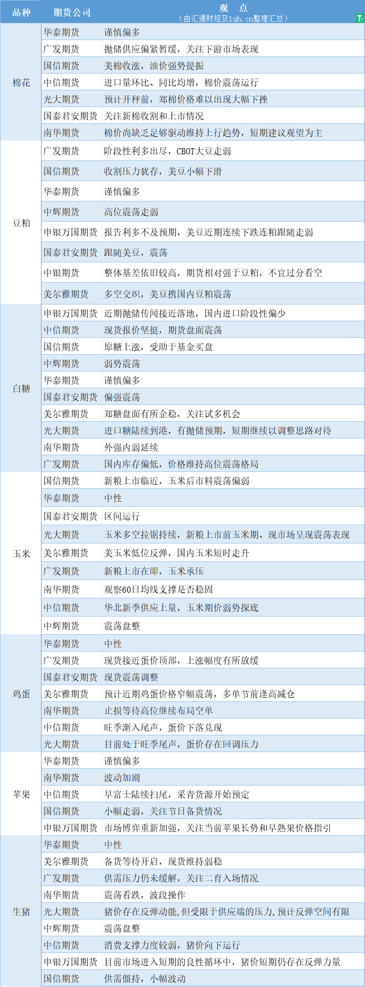 汇通财经APP讯——期货公司观点汇总一张图:9月20日农产品(棉花、豆粕、白糖、玉米、鸡蛋、生猪等)