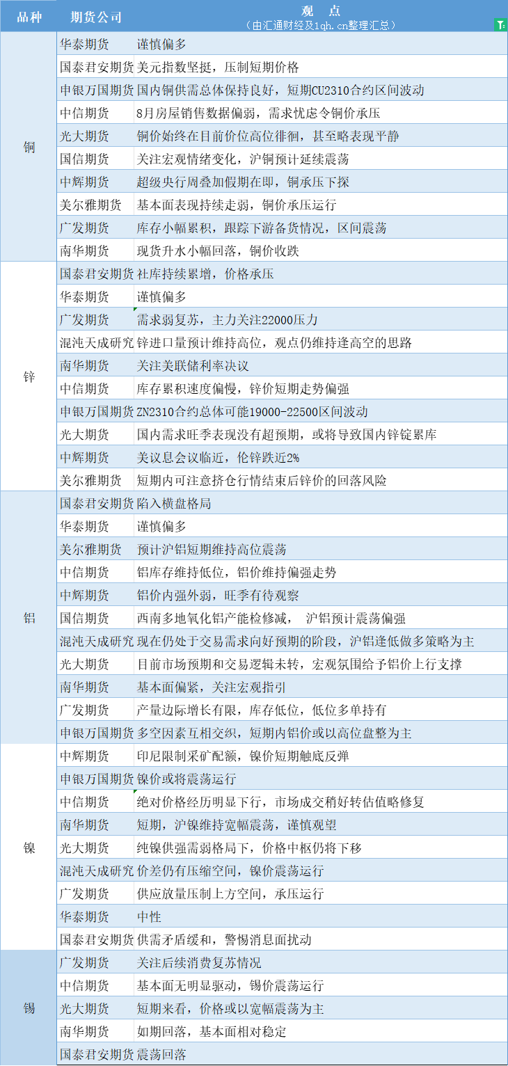 汇通财经APP讯——期货公司观点汇总一张图:9月20日有色系(铜、锌、铝、镍、锡等)
