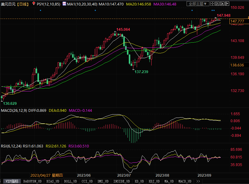 周二(9月19日),美元兑日元略上升了0.17%,报147.85,继续保持在年内的高点附近。尽管日本央行总裁植田和男的讲话引发外界猜测日本央行即将放弃超宽松政策,但市场预期日本央行周五将维持超低利率,并向市场保证货币刺激政策至少目前不会改变。加之美联储本周的利率会议也召开在即,若美联储对今后的利率前景继续保持鹰派态度的话,势必刺激美元兑日元继续尝试冲高。但是,周二日本财务省副大臣神田真人表示,日元过度波动不可取;始终与美国财政部密切沟通联系,必要时将针对外汇市场采取适当措施,且不排除任何选项。日本政府开始出现欲干预的前兆。因此,要谨慎防范日本政府机构入市干预所带来的变盘风险。