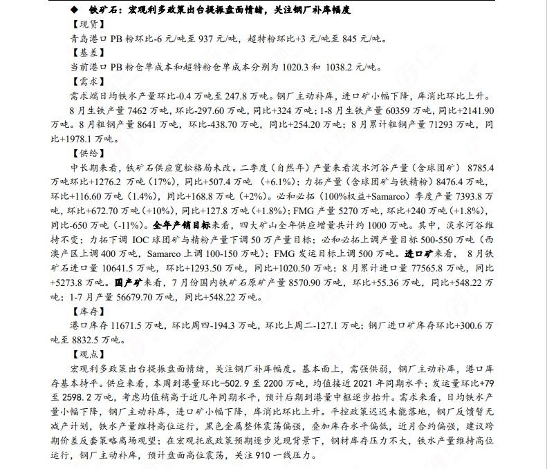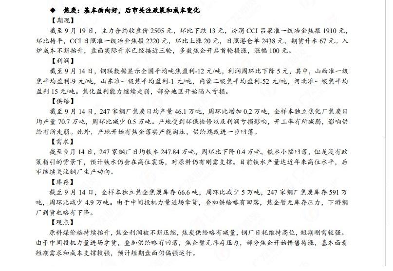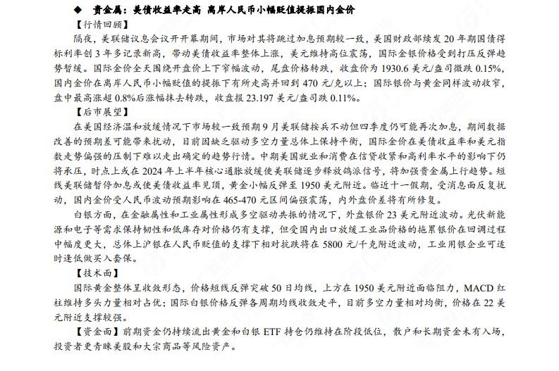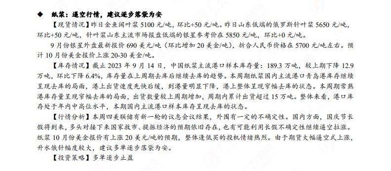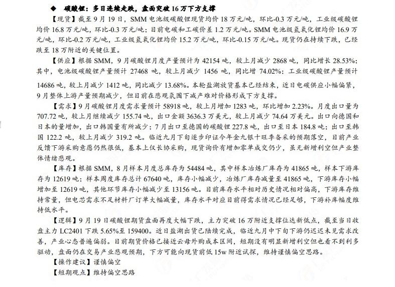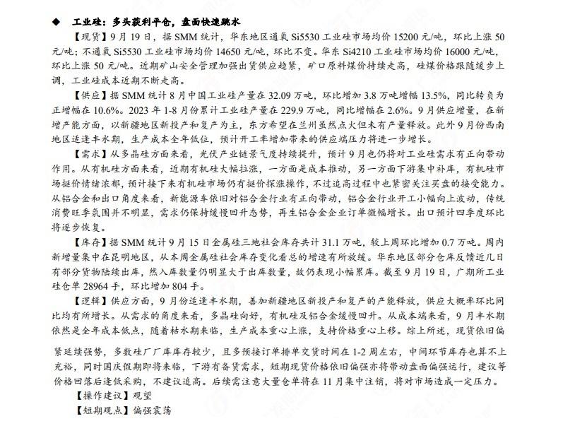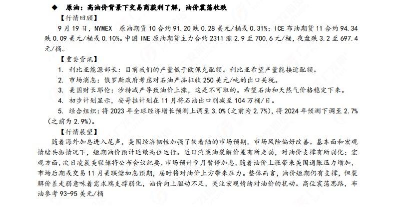 汇通财经APP讯——广发期货发布9月20日早知道,建议铝低位多单持有,小止损;碳酸锂维持偏空思路;钢材偏强震荡走势,铁矿石预计盘面高位震荡,关注910一线压力;焦炭短期预计仍偏强运行;原油高位震荡思路,布油参考93-95美元;纸浆多单逐步止盈,工业硅偏强震荡。