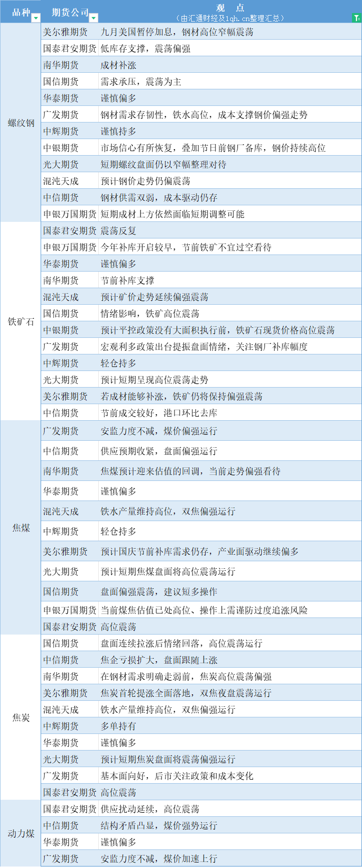 汇通财经APP讯——期货公司观点汇总一张图:9月21日黑色系(螺纹钢、焦煤、焦炭、铁矿石、动力煤等)