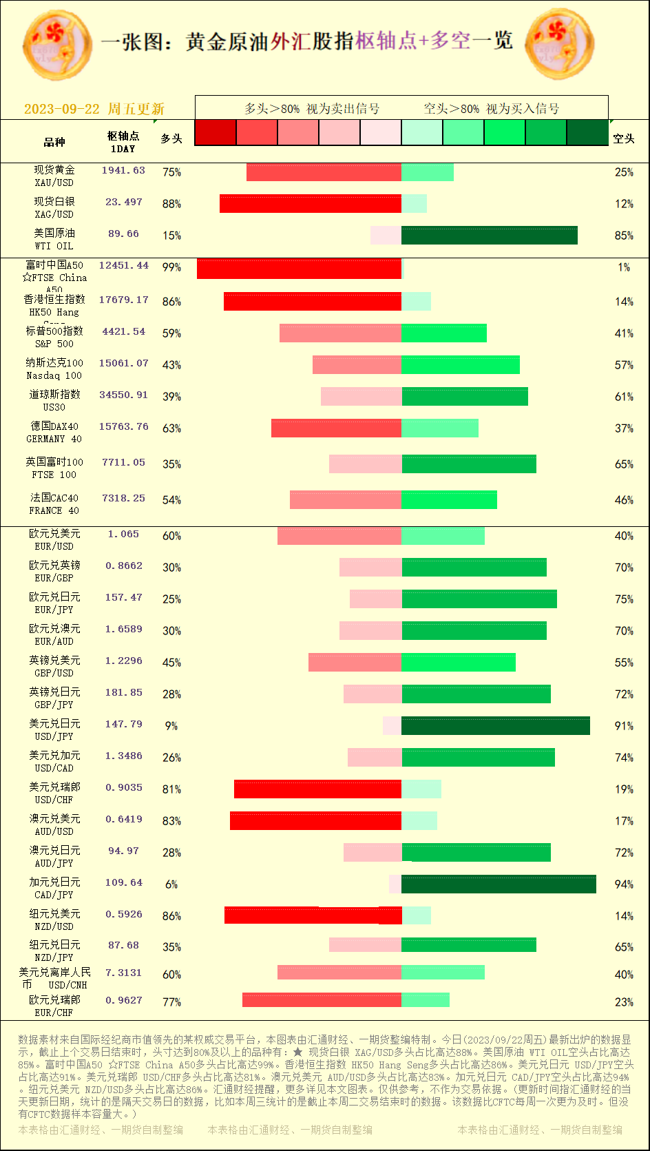 标题:一张图:2023/09/22黄金原油外汇股指"枢纽点+多空占比"一览