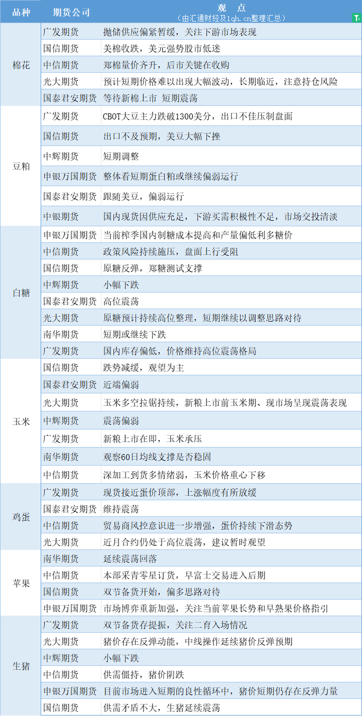 汇通财经APP讯——期货公司观点汇总一张图:9月22日农产品(棉花、豆粕、白糖、玉米、鸡蛋、生猪等)