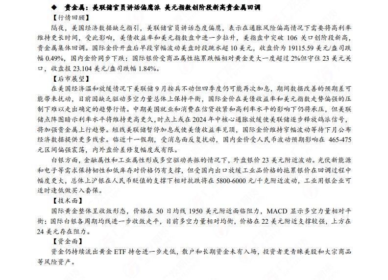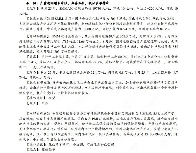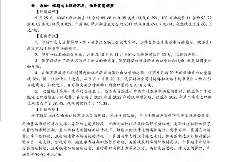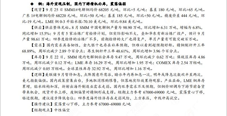 汇通财经APP讯——广发期货发布9月26日早知道,铜震荡重心下移,主力参考67000-69000元/吨,铝低位多单持有,小止损,节前注意仓位管理;钢材回调后依然可以偏多参与,焦炭回调后仍有继续上行驱动;原油高位震荡思路,建议区间操作,布油参考90-95美元/桶。