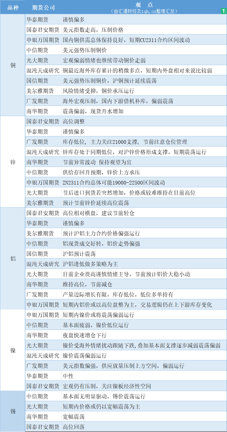 汇通财经APP讯——期货公司观点汇总一张图:9月27日有色系(铜、锌、铝、镍、锡等)