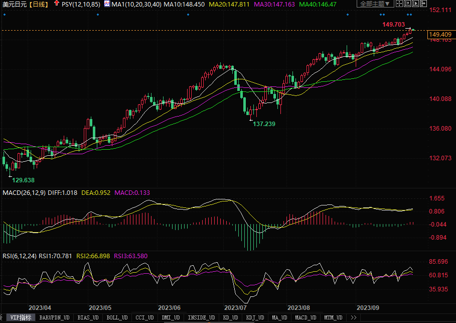 周三(9月27日),美元兑日元盘中升至11个月高点 149.71。周三公布的日本央行7月会议记录显示,决策者们一致认为有必要维持超宽松货币政策,但在央行多快可以结束负利率政策的问题上存在分歧。会议纪要无改日元贬值趋向,而且当前美元/日元货币对儿往往对美国长期公债收益率的变化极为敏感,尤其是10年期美债收益率。这也是当下驱动美元/日元走势的主要影响因素。只要两国债券收益率一直在拉宽之中,那么即使日本政府出面干预,只要干预态度和力度都不那么大的话,就无法抑制当前美元继续冲高的势头。目前美元/日元汇价已接近警戒线150,还需时刻留意来自日本央行的动静,防范干预行动带来的回调风险。