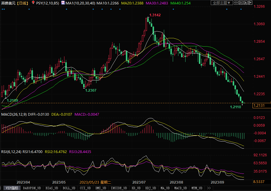 周三(9月27日),在美元继续全面走强的逼迫下,英镑兑美元盘中触及1.2111美元,为3月17日以来最低。最近的数据显示,英国企业9月状况比预期还糟,失业和经济衰退风险不断上升。因在经济恶化、同时英国通胀也降温的情况下,市场认为英国央行已经完成加息。终端利率预期的下降,凸显了英镑的不利因素。本周五,英国还将公布消费者信贷和抵押贷款审批结果等数据,如果数据仍显疲弱,势必进一步摧击英镑导致英镑/美元滑向更深之渊。在接下来的阶段,除非英国经济发展方面传出令人惊喜的增长消息,否则英镑目前还较难脱离不断下滑的走势形态。下方进一步的支撑要落在1.2050-1.2000区域。上方的初步强阻力水平还是在1.23附近。