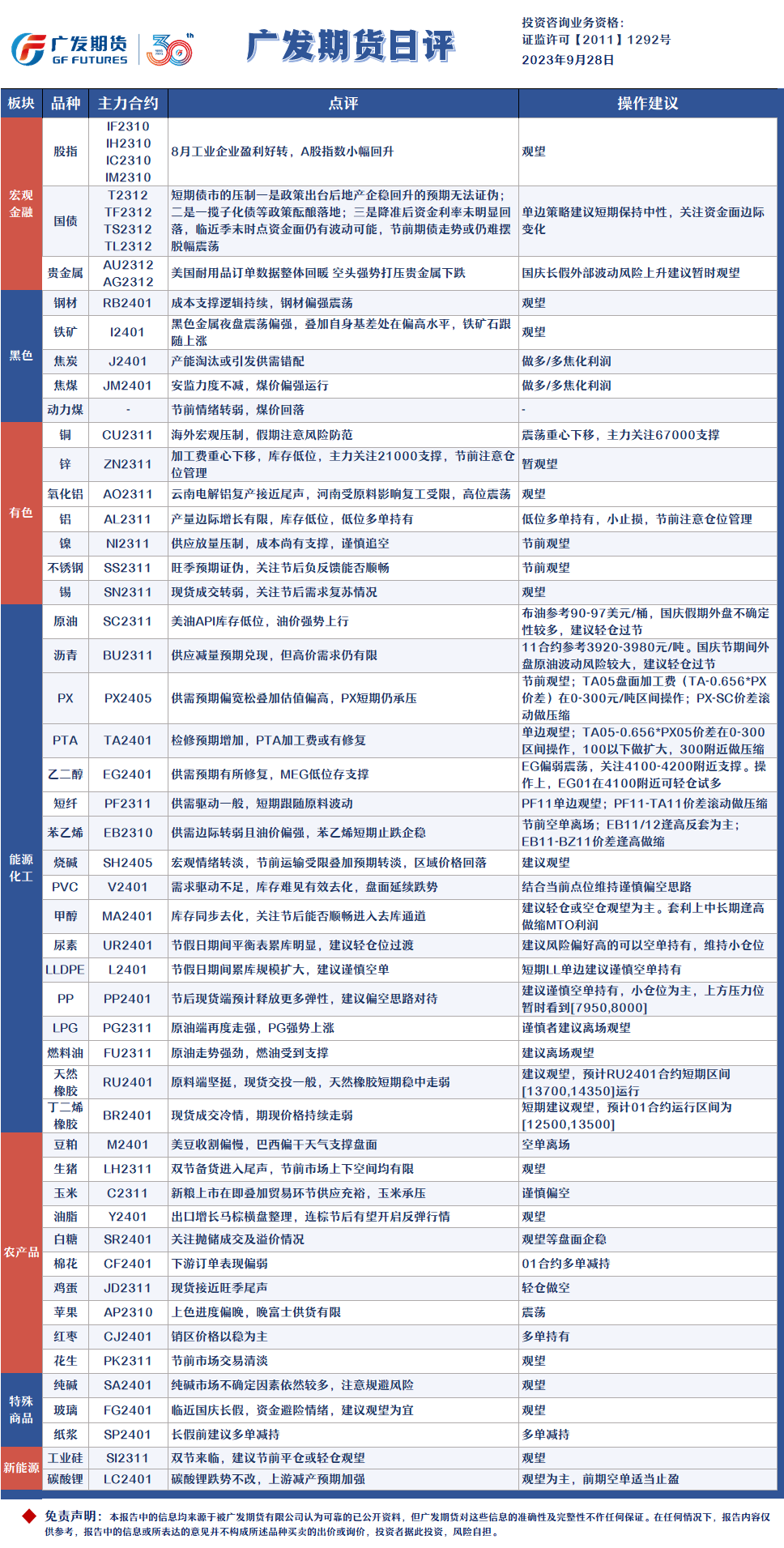 汇通财经APP讯——广发期货发布9月28日日评,称国庆长假外部波动风险上升,贵金属建议暂时观望;铜震荡中心下移,主力关注67000支撑;铝低位多单持有,小止损,节前注意仓位管理;布油参考90-97美元,国庆假期外盘不确定性较多,建议轻仓过节;玉米谨慎偏空。