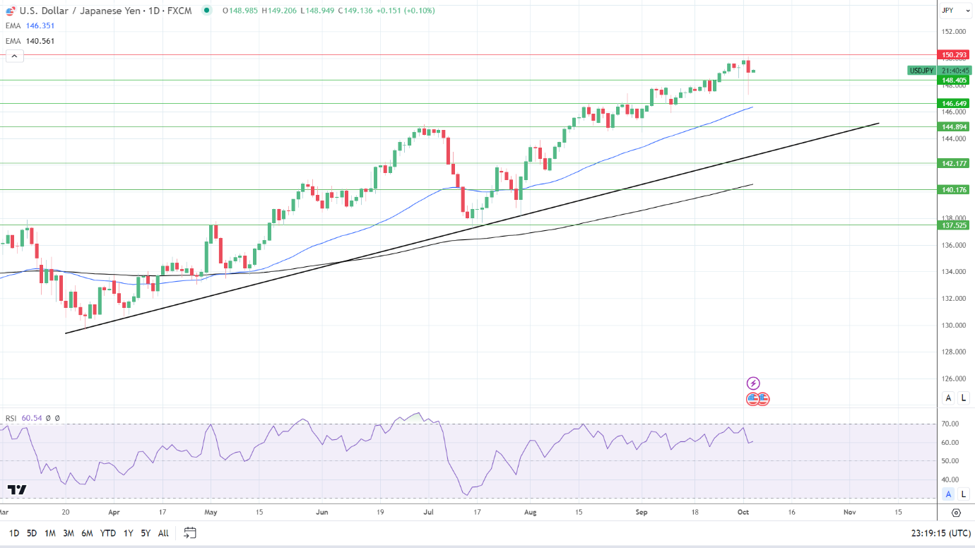 周三(10月4日)亚市早盘,美元/日元回落至149.23,无法站稳突破150大关的多头走势。外汇交易员保持谨慎态度,因担忧日本央行出手干预,使日元得到短暂的喘息空间。日本首席货币外交官Masato Kanda表示,有必要时将指示日本央行进行干预。他称,将采取适当措施反对过度举动,但不排除任何选择。