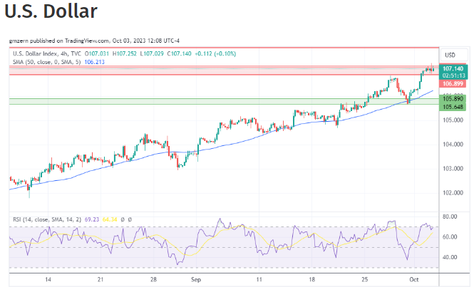 周三(10月3日)亚市,美元指数维持强势,目前交投于107.02附近,略低于周二创下的近10个月高点107.35。