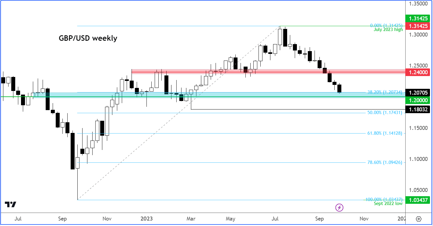 进入2023年最后几个月,英镑兑美元仍处于长期下行趋势。虽然不能排除超卖反弹的可能性,但City Index and Forex.com分析师Fawad Razaqzada认为第四季度可能会出现更多损失,英镑可能跌至1.20或更低。