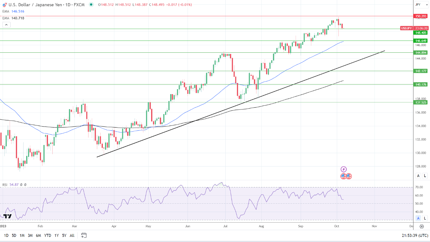 然而,日本家庭支出和工资的跃升将支持跌破148.405支撑位,目标是146.649支撑位和50日均线。146.649支撑位的买盘压力可能会加剧,50日均线与支撑位汇合。14天RSI为54.47,表明美元/日元在进入超买区域之前将升至150.293阻力位。
