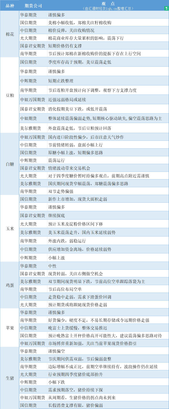 汇通财经APP讯——期货公司观点汇总一张图:10月9日农产品(棉花、豆粕、白糖、玉米、鸡蛋、生猪等)