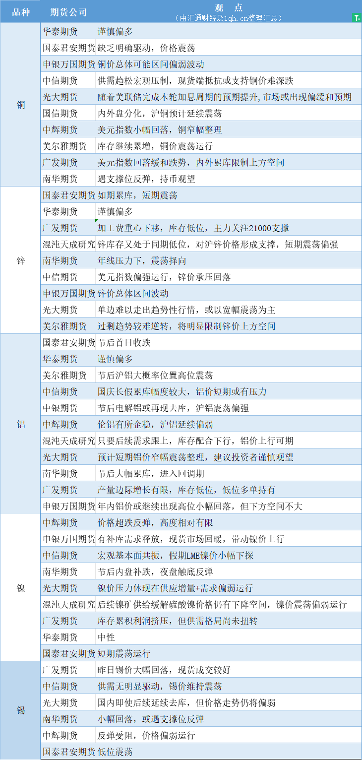 汇通财经APP讯——期货公司观点汇总一张图:10月10日有色系(铜、锌、铝、镍、锡等)