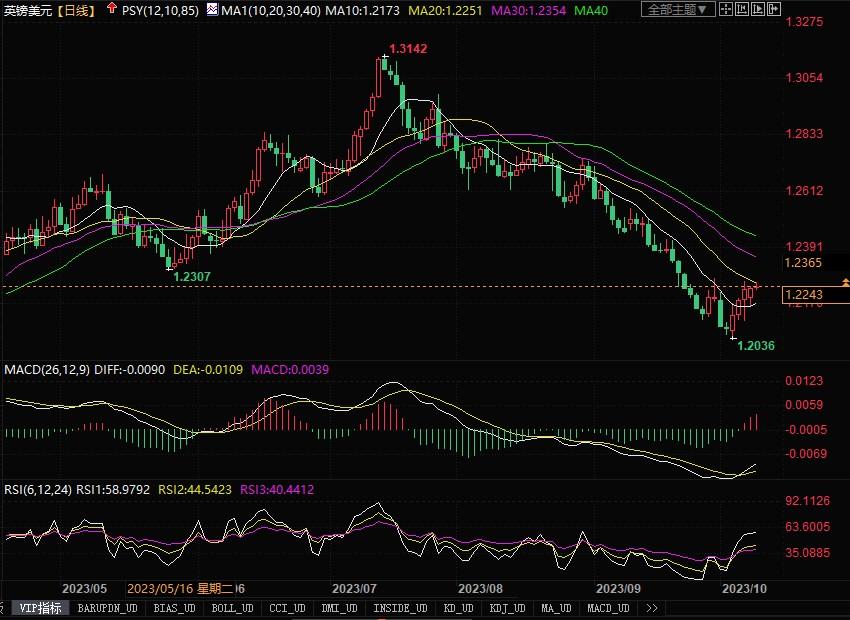 周一(10月9日),欧元兑美元略保住了近期的反弹回升势头,收盘于1.0565,当日略涨0.09%。虽然周一的外汇市场上,巴以冲突仍在继续中,但避险买盘未能给到美元太大的刺激抬捧。这主要是,自上周五美国公布非农数据后,根据芝商所的数据,投资者预计美联储不会在11月再次加息。期货走势也显示,市场预计美联储决策者在11月政策会议上维持利率不变的可能性为88.5%。美联储利率调整的前进步伐有望缓下来,暂时也是给到其他非美货币喘息的机会。但是,周一当日的数据显示,德国8月份工业生产环比下降0.2%,降幅略高于预期,这再次引发了对欧元区经济衰退的担忧。为此,欧元近几个交易日形成的反弹势能也遭到一定的平抑。日线图上,欧元/美元仍处在布林带通道中轨线之下,各类技术指标有拐头迹象,显示欧元经过前期的沉重抛压之后,有进入反弹调整的交易节奏迹象。目前上方1.0600附近构成初步的阻力所在,若能冲破,有望在反弹的节奏带动下,走高一线。相反若遇阻上述阻力水平,恐仍存在回低的风险。