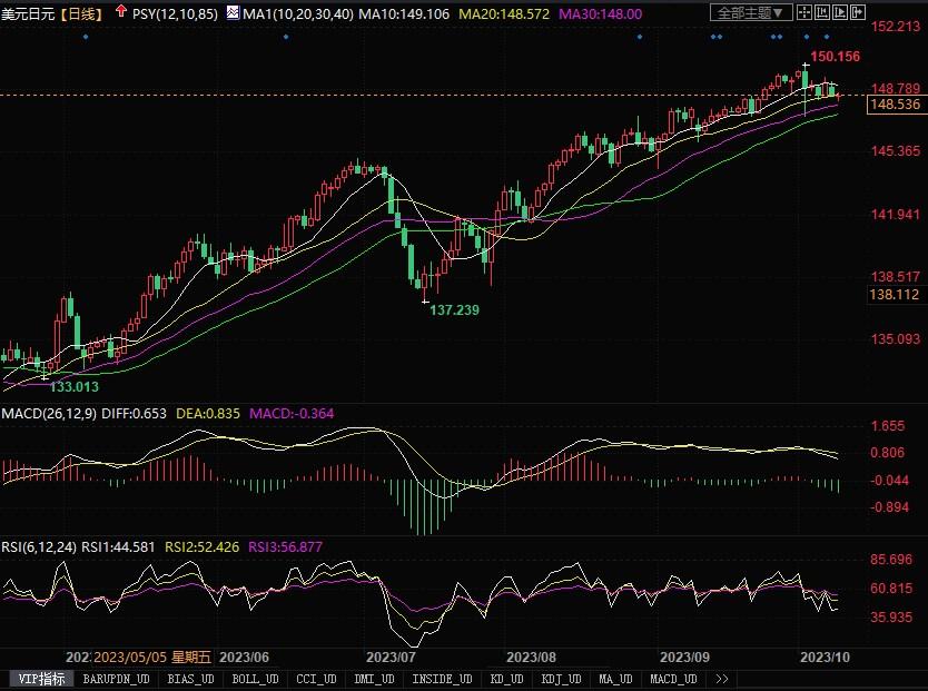 周一(10月9日),美元兑日元下跌了0.57%,至148.49。因中东局势令市场恐慌,作为传统避险货币的日元在交叉盘中受到追捧,从而也间接提升了其兑美元直盘的报价。加之,尽管美国非农就业数据虽然强劲,但尚不足以改变预期美联储11月份维持息口不动的预期。因此,投资者似乎开始找到缓解日元贬值压力的借口。美元/日元很可能会在获利盘的抛压之下出现调整性回落的走势趋向。日线图上,顶背离迹象似乎在逐渐得以印证,价格线也开始有坠落布林带通道中轨线之下的趋向,技术指标趋向下摆。下方密切留意147.50的的支撑,若跌破,要小心调整性回落势头恐将美元/日元拖低至更低的水位。