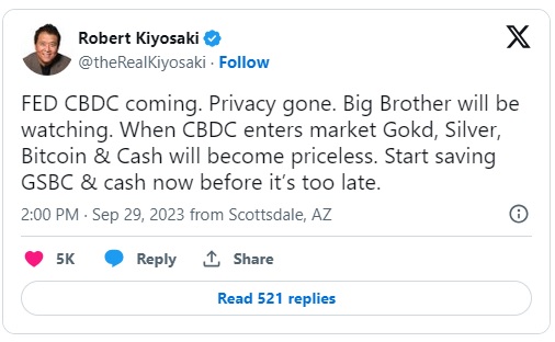 具体来说,清崎认为,美联储的CBDC会导致隐私的丧失,但也会导致黄金、白银和现金的价值增加。他认为这些资产将变得“无价之宝”,并建议投资这些资产,并“在为时已晚之前”将它们保存起来。