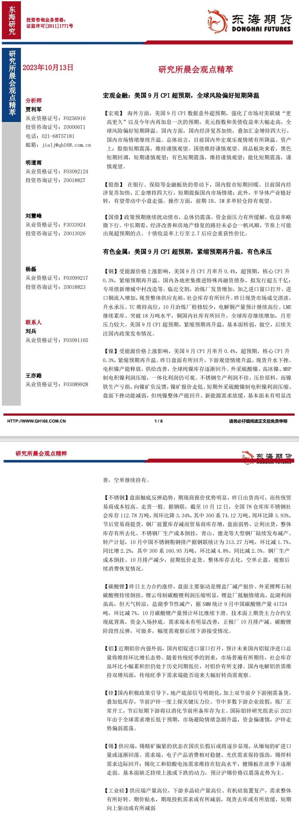 标题:【东海期货10月13日研究所晨会观点精萃】美国9月CPI超预期,全球风险偏好短期降温