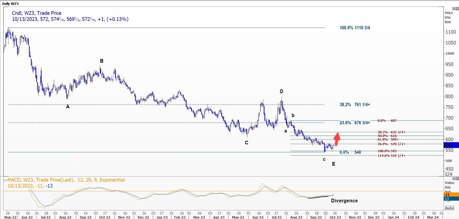 日线图上,双底似乎正在545美分附近形成。当小麦突破578.50美分时将得到确认。尽管该形态很小,但它会确认1119.75美分下降趋势的逆转。