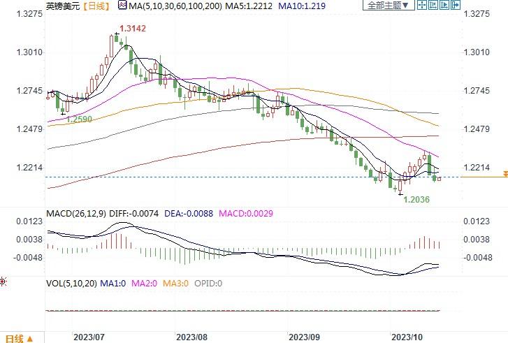 上周五(10月13日),美元兑一篮子货币周五触及一周高点至106.63。欧元/美元继周四大跌之后,周五继续下滑0.2%,收盘在1.0509,盘中最低至1.0494。美国上周反映通胀的数据增长情况仍旧超出预期,导致美指标十年期债券收益率回升,提高了美联储仍有加息一次预期的概率。从而推进美元保持坚挺。此外,中东冲突不断升级,以色列军方称首次对加沙发动地面攻击。避险买盘也是导致美元重新走强的一个重要的推动因素。在风险厌恶情绪提升的情形下,欧元似乎也就没什么值得购入的理由。技术图形上,10日和21日移动均线小幅下滑,波林带通道区间亦然,再次出现负面信号--目标指向10月和年内低点1.0448。10月高位1.0640仍是关键阻力位,若突破将结束下行趋势。而下方1.0496-1.0500是初步支撑区域。