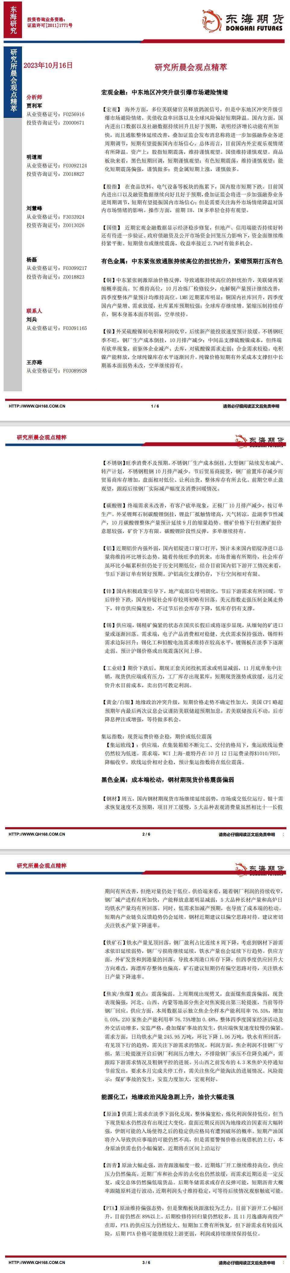 标题:【东海期货10月16日研究所晨会观点精萃】中东地区冲突升级引爆市场避险情绪