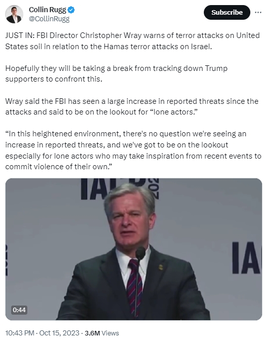 美国FBI局长克里斯托弗·雷(Christopher Wray)周日对记者表示:“在美国,我们不能也不会低估哈马斯或其他组织利用这场冲突号召其支持者在美国土地上发动袭击的可能性。”