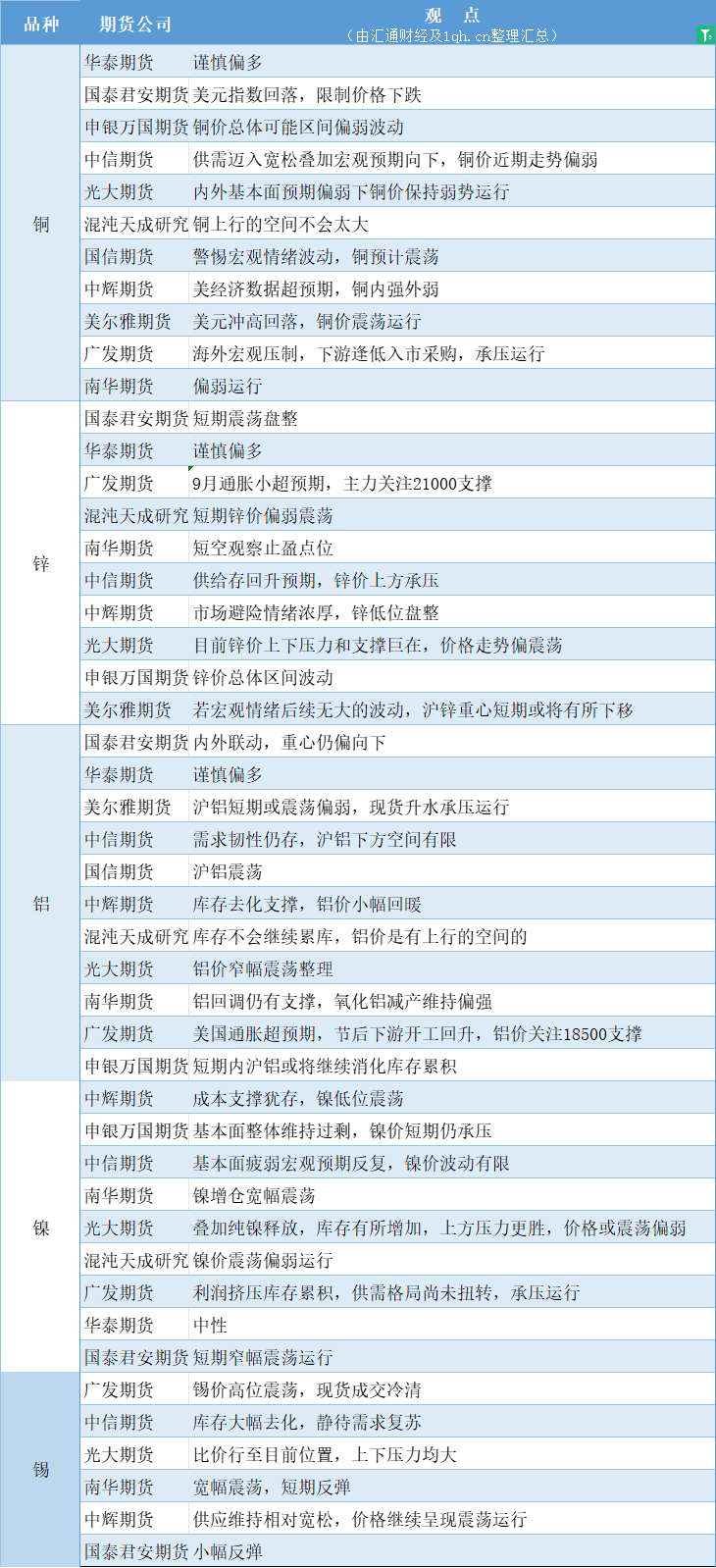 汇通财经APP讯——期货公司观点汇总一张图:10月18日有色系(铜、锌、铝、镍、锡等)