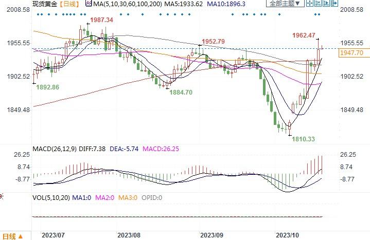 据报道,加沙一家医院的爆炸造成数百名巴勒斯坦人死亡,这标志着冲突可能升级,特别是埃及和巴勒斯坦领导人在袭击发生后取消了与美国总统拜登的会面。此举引发了人们的担忧,即以色列与哈马斯的冲突可能会波及其他阿拉伯国家,导致战争蔓延到更广泛的中东地区。这一观念增加了投资者对避险资产的需求。作为回应,黄金近期也是不断往高处攀升。但也有意见认为,战争规模的扩大,将推升通胀风险。德商银行就表示,中东冲突目前带来相当大的上行风险。如果它蔓延到该地区的其他国家,金价可能会因其避风港的作用而首先上涨。但如果中东军事争端升级或扩大,油价可能会再次大幅上涨,进而增加持续高通胀的风险,并可能引发进一步加息。关于美元的息口问题,美联储理事沃勒周三表示,他希望“等待、观察和观望”美国经济是继续保持强劲势头,还是在联储迄今为止的加息行动后展现疲态。此番发言是一个有力的信号,暗示美联储将不会在下次会议上加息,但很可能在未来加息。纽约联邦储备银行总裁威廉姆斯周三也表示,利率需要在一段时间内保持高位,才能使通胀率回到联储设定的2%的目标。接下来,周四包括联储主席鲍威尔等官员也将要发表讲话,如果也同样保持不放松加息的选项,终归会对黄金产生掣肘影响,从而抑制黄金创高峰的动能。
