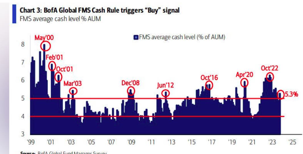 根据美国银行的全球基金经理调查,股市刚刚闪现出可靠的买入信号。这项衡量华尔街专业投资者情绪的调查显示,受访者的现金配置跃升至5%以上。该银行表示,这会引发股票的逆向买入信号,而且从历史上看,这会先于未来的强劲上涨。
