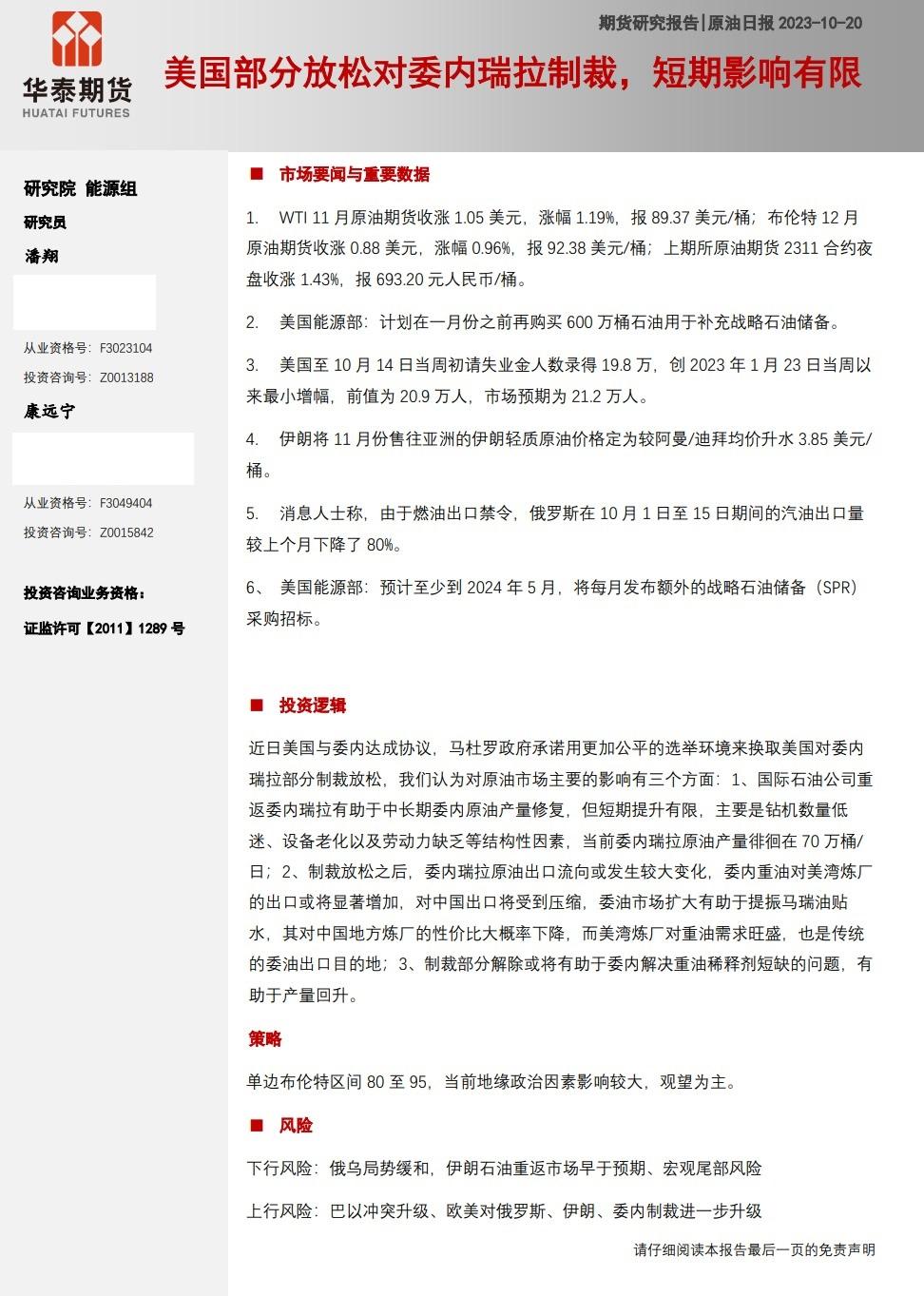 标题:华泰期货10月20日原油日报:美国部分放松对委内瑞拉制裁,短期影响有限