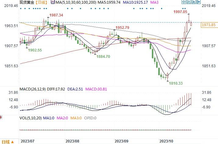 汇通财经APP讯——上周五(10月20日), 随着以色列与哈马斯的战争愈演愈烈,地缘政治的不确定性继续支撑着黄金的避险吸引力,现货黄金盘中一度逼近2000美元,但尾市出现冲高回落,最终收市仅上涨0.36%,收报1981.44美元/盎司。