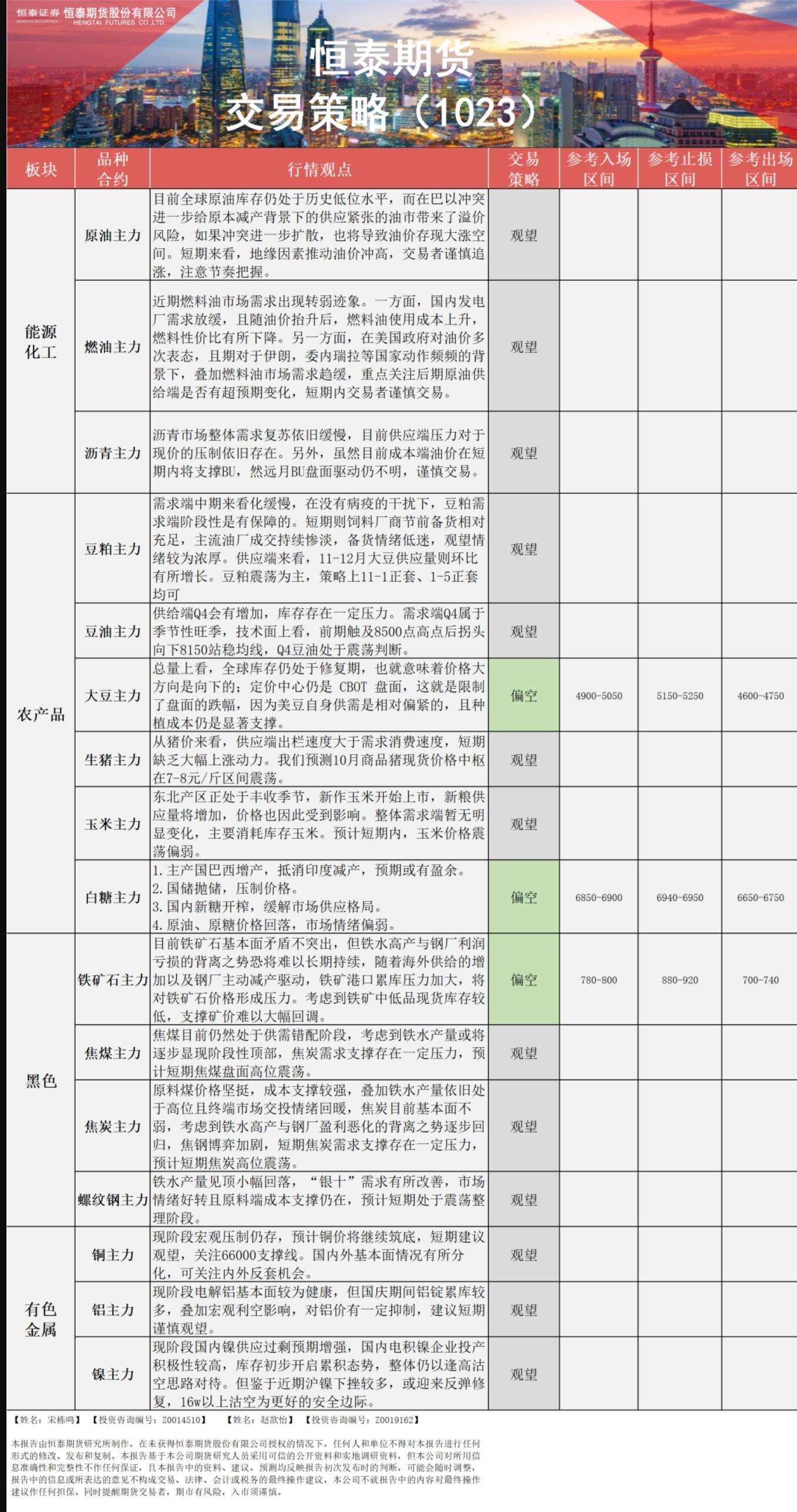 汇通财经APP讯——目前全球原油库存仍处于历史地位水平,短期来看,地缘因素推动油价冲高,交易者谨慎追涨,注意节奏把握,建议观望。以下是恒泰期货10月23日对能源化工、黑色金属、有色金属、农产品交易策略。恒泰期货公司授权文本由“专注期货开户交易及专业行情分析资讯网站”:【一期货 www.1qh.cn】转发