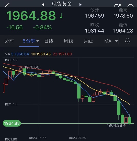 周一(10月23日)亚市盘中,现货黄金震荡走弱,一度下跌逾15美元至1964.23美元/盎司。