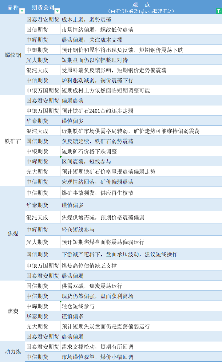 标题:期货公司观点汇总一张图:10月24日黑色系(螺纹钢、焦煤、焦炭、铁矿石、动力煤等)