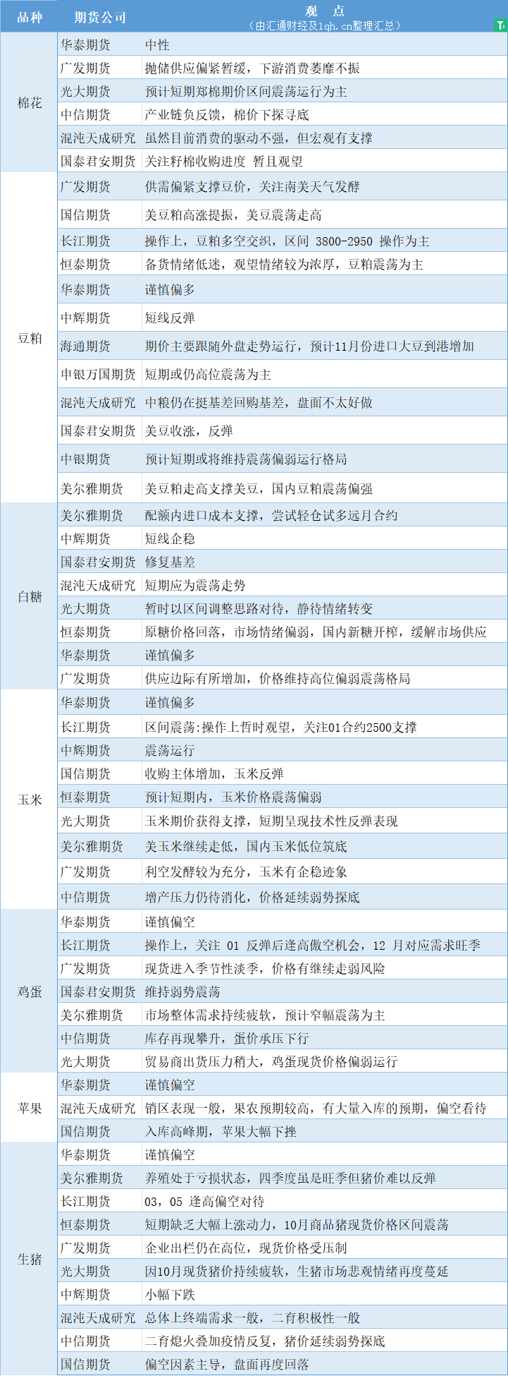 汇通财经APP讯——期货公司观点汇总一张图:10月25日农产品(棉花、豆粕、白糖、玉米、鸡蛋、生猪等)