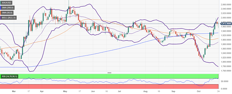 周三(10月25日)亚市早盘,现货黄金窄幅震荡,目前交投于1974.42美元/盎司附近,虽然隔夜美国PMI数据强于市场预期,金价一度承压,但仍受到逢低买盘和避险买盘的支撑。FXStree分析师Christian Borjon Valencia指出,从技术面来看,金价在测试支撑位后仍偏向上行。