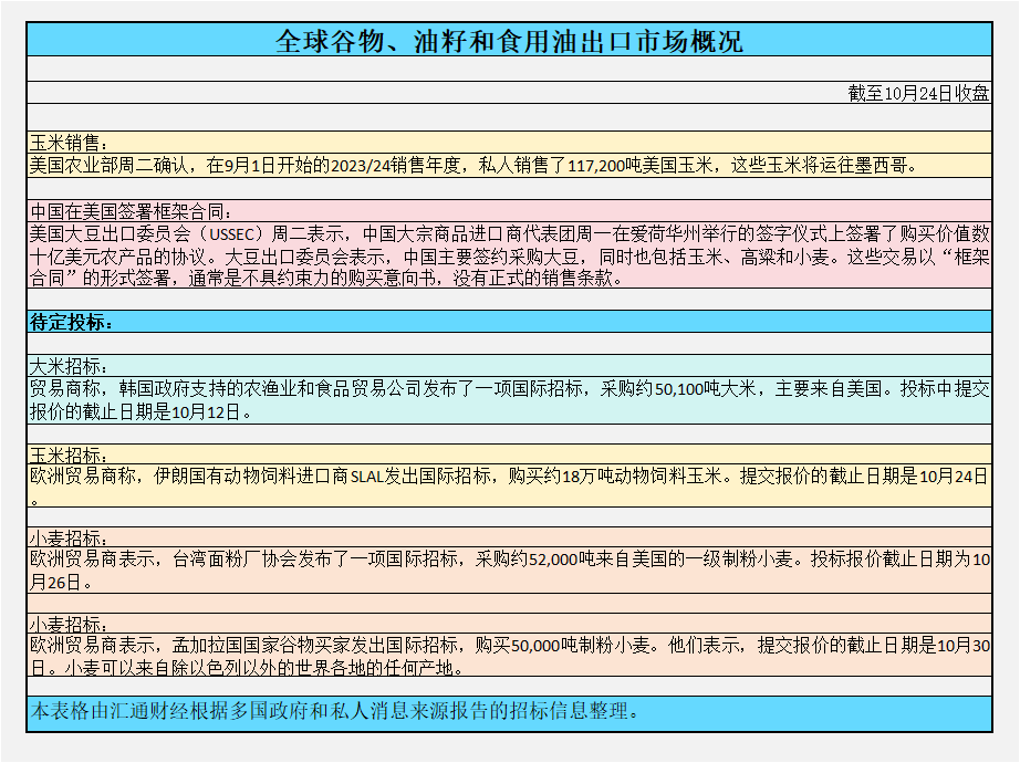 截至周二收盘,多国政府和私人消息来源报道的全球谷物、油籽和食用油出口市场概况: