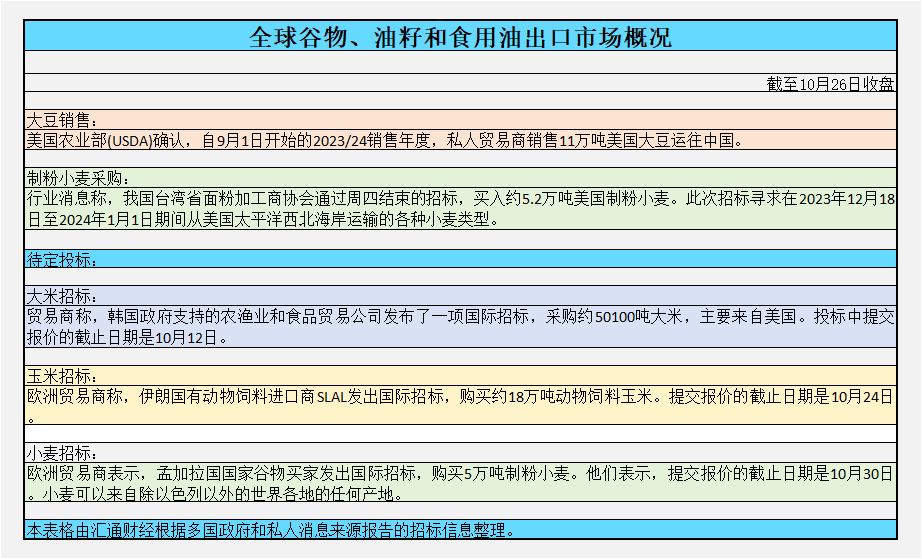 截至周四收盘,政府和私人消息来源报告的全球谷物、油籽和食用油出口市场概况: