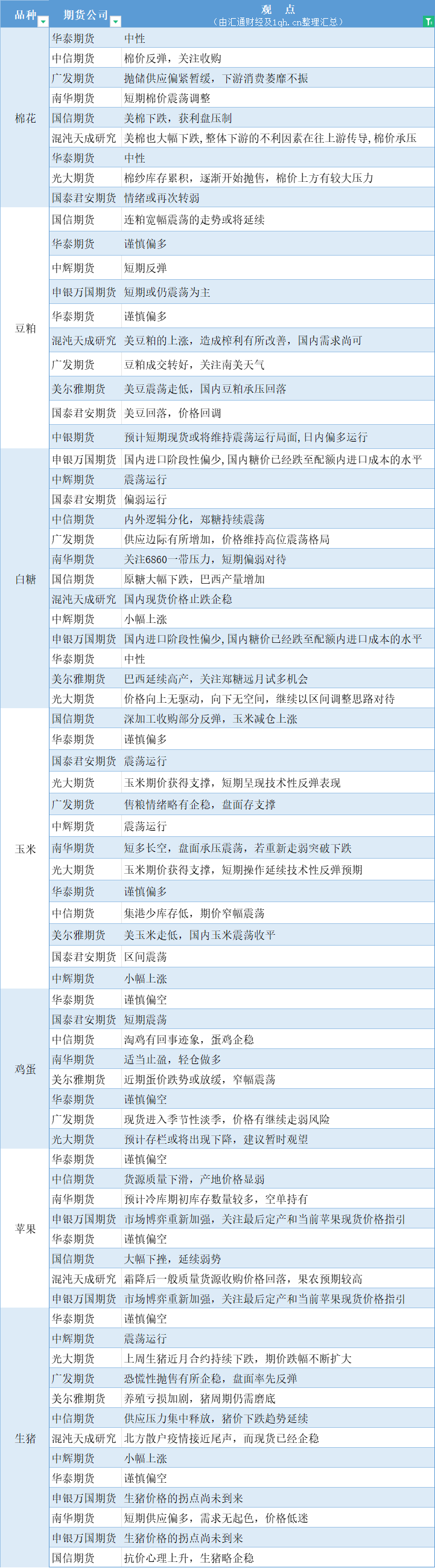 汇通财经APP讯——期货公司观点汇总一张图:10月31日农产品(棉花、豆粕、白糖、玉米、鸡蛋、生猪等)