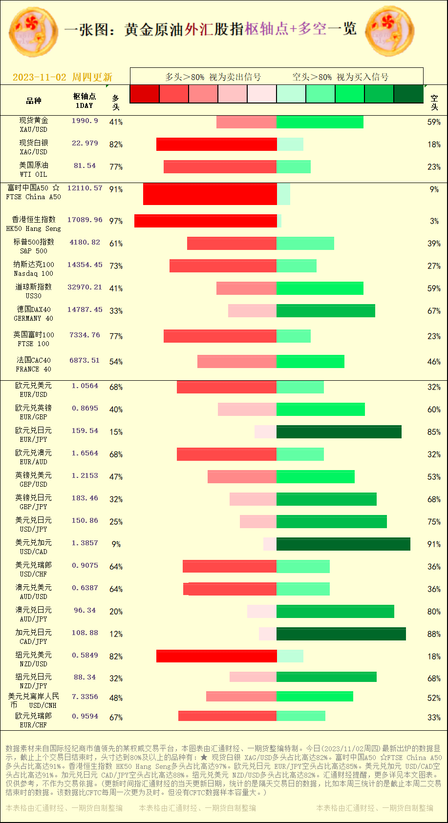 标题:一张图:2023/11/02黄金原油外汇股指"枢纽点+多空占比"一览