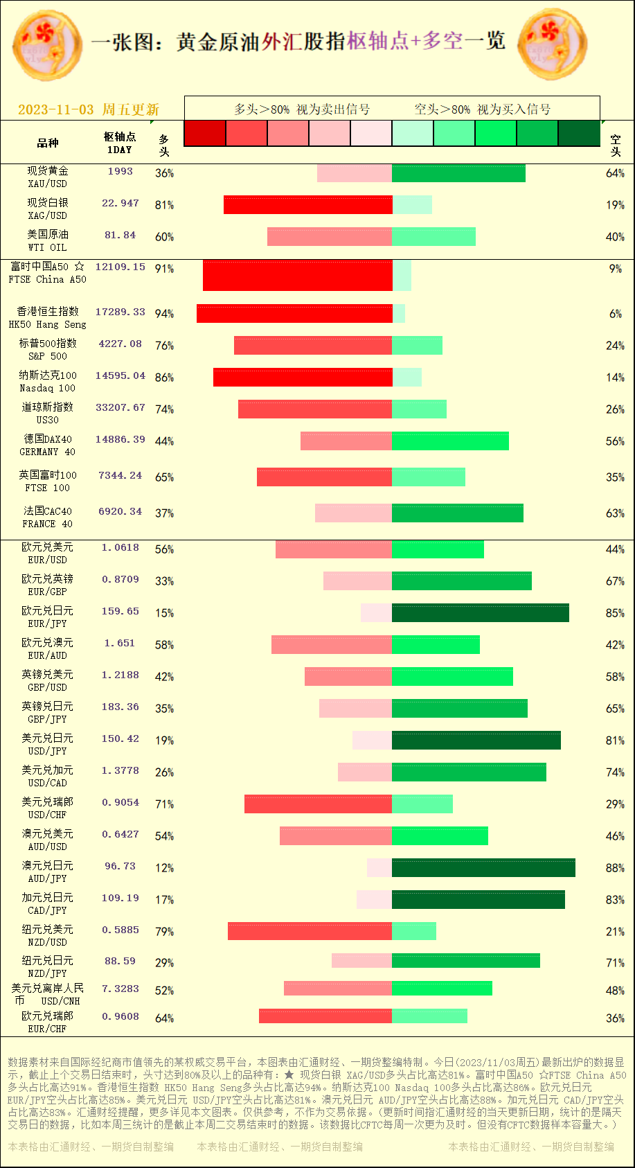 标题:一张图:2023/11/03黄金原油外汇股指"枢纽点+多空占比"一览