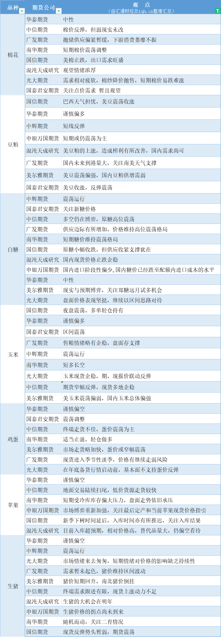 汇通财经APP讯——期货公司观点汇总一张图:11月3日农产品(棉花、豆粕、白糖、玉米、鸡蛋、生猪等)