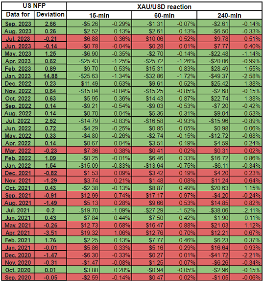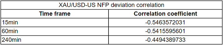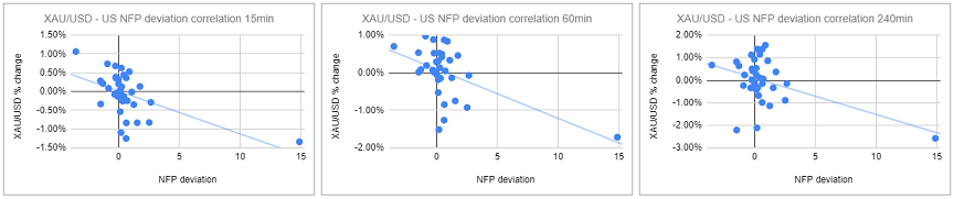 我们绘制了非农数据发布后的15分钟、1小时和4小时内的黄金价格反应。然后,我们将黄金价格的反应与实际非农结果与预期结果之间的偏差进行了比较。